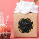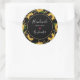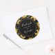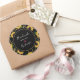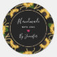 Handgefertigt mit Liebe Aufklebern mit elegantem und stilvollem Muster. Hübsche gelbe Sonnenblumen und grüne Blätter umgeben von zarten Goldketten. Schwarzer Hintergrund. Ein Kreis mit einem Imitat, der mit einem goldenen Rahmen überlagert ist, in dem sich der personalisierte Text befindet.