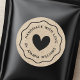 Stickers mit dem Text "Handmade with Liebe" und Ihrem Namen oder anderen benutzerdefinierten Text in einem modernen serifenlosen Schriftart, umgeben von einem dünnen, welligen Rand. In der Mitte befindet sich ein niedliches Herz. Druck-Bild Kraft Papier Blick Hintergrund.