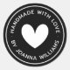 Runde Aufkleber mit weißem Herzen, umgeben von dem Text "handgefertigt mit Liebe" und Ihrem Namen oder anderen benutzerdefinierten Text auf schwarzem Hintergrund. Verwendung als Aufkleber für Geschenke und Gefälligkeiten, Produktverpackung usw.