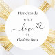 Ein stilvoller weißer Hintergrund, schwarzer Text. Personalisieren Sie Ihren Namen und fügen Sie ihn hinzu. Mit dem Text: Handmade mit Liebe, von + ein kleines Herz.