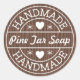Aufkleber mit dem Text "Handmade" in Weiß, als Briefmarke auf dunklem Holzhintergrund. Anpassbarer Produktname.