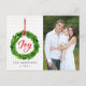 Einfache, rustikale Urlaubspostkarte mit einem grünen Aquarellkranz, aufgehängt von einem roten Band mit "Joy" in einem roten Skript mit weißem shiplap Hintergrund. Personalisieren Sie die Vorderseite der Urlaubskarte, indem Sie Ihren Namen, das Jahr und ein Foto hinzufügen. Die Weihnachtskranz-Postkarte kehrt um, um Ihre Rücksendeadresse und Platz für eine benutzerdefinierte Nachricht.