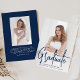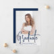 Moderne Abschluss-Ankündigung mit Ihrem vertikalen Foto auf der Vorderseite mit "Graduate" in einem handgeschriebenen Marine-Skript-Overlay angezeigt. Personalisieren Sie die Titelseite der Ankündigung des Foto-Abschlusses mit dem Namen des Absolventen, Schulname und Abschluss Jahr. Die einfache Ankündigung des Abschlusses kehrt zurück, um ein zusätzliches Foto mit Platz zur Verfügung zu stellen, um die Pläne des Absolventen, Abschluss Details, etc. enthalten. Die Ankündigung von 2 Foto Abschluss ist perfekt für High School und Uni-Abschlüsse!