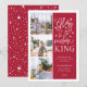 Eine schöne typografische Urlaubskarte mit drei Ihrer beliebtesten Fotos in einem quadratischen Format entlang der links Seite. "Ruhm zum Neugeborenen" erscheint auf der rechten Seite in weißer Hand mit Schriftzeichen auf einem lebendigen, roten Hintergrund mit festlichen Sternen. Passen Sie mit Ihrem persönlichen Gruß, Familiennamen, individuellen Namen und dem Jahr an. Karten kehren zu einem Muster von weißem Schnee und Sternen auf einem passenden Hintergrund zurück.