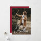 Moderne Urlaubsfotokarten mit Ihrem vertikalen Foto mit "Frohe Weihnachten" in einem weißen handgeschriebenen Drehbuch. Personalisieren Sie die Weihnachtskarte des Fotos mit Ihrem Familiennamen und dem Jahr. Die Single Foto-Urlaubskarte kehrt um, um einen bordeauxroten Hintergrund mit feinen weißen Punkten anzuzeigen.