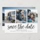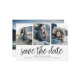 Eine moderne Save the Date-Karte, die für vier Ihrer Lieblings-Verlobung-Fotos konzipiert wurde, drei vorne und ein zusätzliches volles Foto auf der Rückseite. "Save the Date" erscheint unter Ihren Fotos in handgeschriebenen Schriftzeichen mit Ihren Namen, Hochzeitstermin und Hochzeitsort unten. Fügen Sie Ihre Hochzeitswebsite auf den Rücken und ein Hinweis darauf, dass eine formelle Einladung folgen wird.