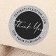 Elegantes Business-Dankeschön für Ihren Einkauf Aufkleber mit dem Text "danke" in einem weißen, handgeschriebenen Schriftart über einem schwarzen Kreis mit einem bedruckten, grauen Papierrahmen. Ändern Sie die Schriftart, verschieben Sie das Logo und andere Elemente mit dem Designwerkzeug.