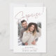 Haben Sie noch nicht das Set, aber können es nicht warten, die guten Neuigkeiten mit Familie und Freunden zu teilen? Mit diesen einfachen und lichtdurchfluteten Fotokarten, die ein vertikal oder portrait orientiertes Foto mit "Überraschung!" an der Spitze in handgezeichneten Schriften darstellen, verkünden Sie Ihre Verlobung. Personalisieren Sie Ihre Bestellung mit drei Textzeilen am Ende, einschließlich Ihrer Ankündigung, Namen und einer Notiz, die für weitere Details bleibe werden soll.