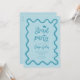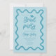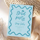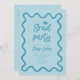 Funky Graduation Party Einladungskarte mit handgezeichnetem, schnörkelhaftem und gewelltem Rahmen. Blauer Hintergrund.