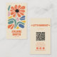 Eine Vintage Retro farbenfrohe florale Blume Visitenkarte. Wie Sie sehen, zeichnet es sich durch ein handgefertigtes, groovy blumengeschmücktes Muster von boho abstrakten Blume-Gängen aus. Es hat nostalgische 70er-Jahre-Villen und Farben und fromme Schriftart. Und Sie können einfach und einfach den Namen und Beruf und QR-Code anpassen. Klicken Sie auf die Schaltfläche Personalisieren. Nehmen Sie es und machen Sie es zu Ihrem Geschäft, damit Ihr Geschäft eingängig und ganz anders ist.