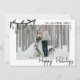 Versenden Sie Weihnachtsgrüße mit dieser horizontalen flachen Weihnachtskarte. Die Vorderseite zeigt ein großes Foto, akzentuiert mit einem schwarzen, gekritzelten Girlanden-Schmuck aus immergrünen Zweigen und hängenden Ornamenten in der oberen linken Ecke, die das Bild leicht überlappen und einen lässigen, handgezeichneten Look erzeugen. Oben rechts ist Platz für Ihre Namen oder den Familiennamen und das Jahr in einer einfachen schwarzen Handschrift, während unten rechts "Frohe Weihnachten" in einer schwarzen kalligraphischen Schriftart steht.