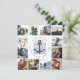 Mit dieser einzigartigen quadratischen Save the Date Karte können Sie 12 beliebte Fotos teilen. Ihre Fotos sind um eine handgezeichnete nautische Ankerillustrierung in marineblau angeordnet, mit Ihren Namen, Ihrem Hochzeitstag und Ihrer Position rund herum gebogen. Karten umkehren zu schicken Küstenschiffen und weißen Streifen.