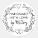 Handgefertigt mit Liebe ... kundenspezifische Aufkleber für Ihre Schreibwaren oder Produktetiketten. Personalisiert mit Ihrem Namen oder Firmennamen, dieses niedliche Design hat ein Doodle gezeichnet botanischen Kranz mit Herz und Laub. Es ist mit moderner Typografie und lässigen handgeschriebenen Pinselskripten versehen. Ein rustikales Design im Landhausstil für Handwerker und Handwerker.