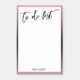 Dieses schlichte Design mit weißem Hintergrund, umgeben von einem rosa Rahmen, der in jede gewünschte Farbe geändert werden kann. Dieser Hintergrund wurde mit einem schwarzen Farbverlaufsbild überlagert, das einen ombre-Effekt erzeugt. Ich habe einen lässigen handgeschriebenen Schriftart benutzt, um eine Grafik zu erstellen, die "To do List" lautet, und sie ganz oben verstellt. Ihr Name erscheint unten in einem Schriftart mit allen Kappen, Serif, der geändert werden kann, wenn Sie möchten.