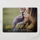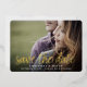 Eine moderne Save the Date-Karte, die für Ihr beliebtes, horizontal oder landschaftsorientiertes Vollblutkarton-Foto entwickelt wurde. "Save the Date" erscheint als Overlay am unteren Rand in handgeschriebenen Schriftzeichen aus Goldfolie, darunter Ihre Namen, Ihr Hochzeitstermin und Ihr Hochzeitsplatz. Fügen Sie Ihre Hochzeitswebsite auf den Rücken und ein Hinweis darauf, dass eine formelle Einladung folgen wird.