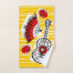 Whimsisches Design im Retro-Stil mit Souvenirs aus einem spanischen Urlaub gezeichnet; Gitarre aus Schmiedeeisen, Fächer aus Laky und rote Rose auf gestreiftem Hintergrund. Ein individuell gestaltbares Design in Schwarz, Weiß, Rot und Gelb für Sie, um mit Ihrem eigenen Text, Bildern und Ideen zu personalisieren. Ein originelles digitales Kunstbild.