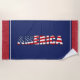 Dieses Badetuch wird in einem Navy Blue Handtuch mit Enden in Red Imitats Glitzer Farbe und einem koordinierenden massiven Streifen gezeigt. Hat ein riesiges "Amerika" in den US Flagge in der Mitte des Handtuches. Passen Sie dieses Objekt an oder kaufen Sie es wie geplant.