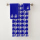 Der Anker des weißen Schiffes wird mehrmals auf einem dunkelblauen Hintergrund auf einem Badetuch nachgebildet. Anker des Single in der Ecke des Waschtuchs. Vier Anker auf einem Handtuch am Ende.