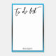 Dieses einfache Design hat einen weißen Hintergrund, umgeben von einem himmelblauen Rahmen, der in jede beliebige Farbe geändert werden kann. Dieser Hintergrund wurde mit einem schwarzen Farbverlaufsbild überlagert, das einen ombre-Effekt erzeugt. Ich habe einen lässigen handgeschriebenen Schriftart benutzt, um eine Grafik zu erstellen, die "To do List" lautet, und sie ganz oben verstellt. Ihr Name erscheint unten in einem Schriftart mit allen Kappen, Serif, der geändert werden kann, wenn Sie möchten.