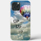 Rainbow gemusterter Heißluftballon, der sich in den flauschigen weißen Wolken in einem blauen Himmel erhebt. Text lautet "UP ... Up ... up ..."