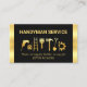 Ein schwarzes Cover wird durch goldene Streifen an den links und rechten Kartengrenzen eingekapselt. Es verfügt über ein Handyhandwerksmotiv aus Gold in der Nähe des Zentrums. Die Tools können einige der Dienste darstellen, die Sie anbieten können. Oben befindet sich der Firmenname mit den Kontaktdaten und Ihrem prestigeträchtigen Namen in der Nähe der Kartenbasis. Oben ist das goldene Hammer-Logo, das Sie benutzen können. Danach folgen Ihr Name, Ihre Kontaktdaten und ein Slogan, um Ihre Dienste bekannt zu machen. Alle Schriften sind in Imitat Gold. Ein großartiges Design für alle, speziell für den Bau und Handwerksbetrieb. #handyman #homerepairtraiter #handymantools #construction #tragner #builder #remodeling #buildingtragnehmer #homerepair #roofing #generaltragnehmer #zazzlemade
