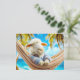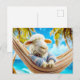 Ein Wollschaf, das friedlich in einer Hängematte unter tropischen Palmen erklettert ist, mit einem traumhaft blauen Himmel darüber. Eine humorvolle und spielerische Illustration, die Urlaubsvisionen mit der sanften Stille eines Schafes vermischt.
