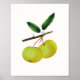Zwei helle Soulard-Äpfel, die an einem Baumzweig mit zwei mittelfarbigen grünen Blätter hängen.
