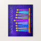 "Frieden, Liebe und Licht." Eine spielerische, moderne, künstlerische Abbildung von Boho Musterkerzen in einer Menorah hilft Ihnen, den Urlaub von Hanukkah zu beginnen. Die blauen Kerzen mit bunten Imitat-Folienmustern überlagern einen reichen, tiefblauen, strukturierten Hintergrund. Genießen Sie die Wärme und Freude der Ferienzeit, wenn Sie dieses atemberaubende, farbenfrohe Hanukkah-Puzzle benutzen. Passende Karten, Umschläge, Aufkleber, Totbeutel, Packpapier, Serviertablette, Zuhause Dekor und vieles mehr sind ebenfalls erhältlich. Macht einen tollen Sake präsent! Kommt in eine besondere Geschenkboxen. Geben Sie das Jahr ein, ändern Sie den Gruß oder löschen Sie ganz, und Sie können dieses Puzzle leicht personalisieren. Bitte schicken Sie mir eine Nachricht mit Fragen oder Wünschen.