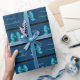 Hier haben wir ein schönes Packpapier mit den Worten "Happy Hanukkah" auf einem dunkelblauen Streifen mit einem glitzernden metallischen blauen Bogen auf einem schwarzen Hintergrund. Dieses Papier ist in verschiedenen Größen erhältlich und passt zu anderen Verpackungspapieren, Papiertüchern, Geschenktaschen und einer Grußkarte. Dies ist sicher eine perfekte Ergänzung zu Ihren Geschenken in dieser Ferienzeit.