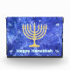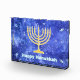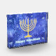 Eine leuchtende goldene Hanukkah menorah und Text lesen "Happy Hanukkah" in leuchtend blau und weiß überlagert auf einem blauen und weißen Fraktal Bild erinnert an Schneeflocken in einem Sturm. Chag Sameach!