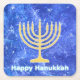 Eine leuchtende goldene Hanukkah menorah und "Happy Hanukkah" in leuchtendem blau-weiß-Text überlagert auf einem blau-weiß-Fraktal Bild erinnert an Schneeflocken in einem Sturm. Chag Sameach!
