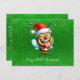 Eine niedliche glückliche Biene, die Geschenke in ihren Flügeln hält, auf grünem Schneeflocken-Hintergrund. "Happ-BEE Christmas!" Text vorne mit Weihnachtsbotschaft auf der Rückseite, auch ein grüner Schneeflockenhintergrund.
