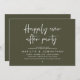 Celebrate the magical evening after “I do” with this sophisticated and romantic wedding reception dinner and dancing invitation — perfect for honouring the couple celebrating their big day. Design Highlights, Modern minimalist aesthetic with bold serif typography and flowing script, “Happily ever after party” headline sets a dreamy, timeless tone, Clean layout with ample space for all essential details (date, time, venue, RSVP info) and Crisp white text on olive green background — classic, chic, and effortlessly elegant. Perfect for Intimate rehearsal dinners, Pre-wedding celebrations with family and close friends and Couples who love modern calligraphy and understated luxury.