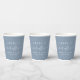 Chic dusty Blue Paper Tassen für Ihre Hochzeitsfeier, Verlobungsfeiern, Probe-Dinner, Paarduschen und andere Hochzeitsfeiern, die "Happily Ever After" in schlichter, moderner weißer Typografie und ein stilvolles, weißes Drehbuch mit Wimpern, Ihre Vornamen verbunden mit einem Herz und Ihr Hochzeitsdatum.