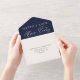 Chic und elegantes Ambiente oder private Hochzeitsankündigung und Hochzeitsempfang in einer Einladung mit hellcremefarbenem Text auf marinebasischem Hintergrund und "Happily Ever After Party" in einer Mischung aus einfacher Typografie und moderner zeitgenössischer Schrift. Eine zerreißende UAWG-Postkarte sorgt für eine bequeme, umschlagfreie Antwort Ihrer Gäste.
