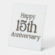 Dieses Podestschild zeigt die Worte "Happy 15th Anniversary" in einem einzigartigen Schriftart mit goldenen Buchstaben, schwarzer Kontur. Gedruckt mit hochwertigem, vollfarbigem Digitaldruck in 4 Größen aus 1/16" weißem Polystyrol 10" x 12" Display mit 3" Sockel.
