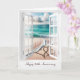 Ein Paar Strandherzen im Sand mit Surfszene im Ozean durch ein offenes Fenster zum 50. Jubiläum.