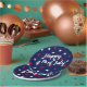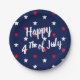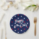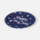 Happy amerikanische Unabhängigkeitstag moderne Skripttext, rot-weiß und marineblau Sterne Muster niedlich lustige feierliche patriotische Feier Papier Teller. Rote und weiße Sterne Muster, marineblau Hintergrund.