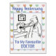 Der Doktor benutzt sein Stethoskop auf den Füßen des Patienten. Personalisieren Sie Ihre persönlichen Daten und Ihre Nachricht. Glückliche Jubiläumskarte für einen Doktor oder Doktor.