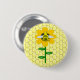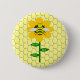 Dieser Knopf zeigt ein grafisches Bild einer niedlichen gelben Hummel mit schwarzen Streifen, Augen, Antennen und Beinen. Es hat hübsche blaue und weiße Flügel. Die Biene sitzt inmitten einer goldgelben Sonnenblume. Die Blume hat einen grünen Stiel und drei Blätter. Die Meldung "Happy Bee Day" erscheint auf den drei Blätter verteilt. Der Hintergrund besteht aus einem gelben Wabenmuster.