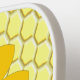 Dieses phantastische Pickleball-Paddel zeigt ein grafisches Bild einer niedlichen gelben Hummel mit schwarzen Streifen, Augen, Antennen und Beinen. Es hat hübsche blaue und weiße Flügel. Die Biene sitzt inmitten einer goldgelben Sonnenblume. Die Blume hat einen grünen Stiel und drei Blätter. Die Meldung "Happy Bee Day" erscheint auf den drei Blätter verteilt. Der Hintergrund besteht aus einem gelben Wabenmuster.