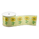 Dieses phantastische Band zeigt ein grafisches Bild einer niedlichen gelben Hummel mit schwarzen Streifen, Augen, Antennen und Beinen. Es hat hübsche blaue und weiße Flügel. Die Biene sitzt inmitten einer goldgelben Sonnenblume. Die Blume hat einen grünen Stiel und drei Blätter. Die Meldung "Happy Bee Day" erscheint auf den drei Blätter verteilt.