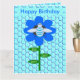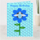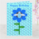 Diese lustige Geburtstagskarte zeigt ein niedliches blaues Hummelbild mit hellblauen Streifen, schwarzen Augen, blauen Antennen und schwarzen Beinen. Es hat hübschen blaue und weiße Flügel. Die Biene sitzt inmitten einer hübschen blauen Sonnenblume. Die Blume hat einen grünen Stiel und drei Blätter. Die Meldung "Bee Day Boy" erscheint auf den drei Blätter verteilt. Der Hintergrund besteht aus einem hellblauen Wabenmuster.