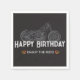 Happy Birthday party for motorcycle riders with a motorcycle silhouette and the slogan "Enjoy the Ride" with orange flames. White and gray on black background for a unique biker party theme.