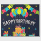 Eine digitale Illustration für eine Geburtstagsfeier mit einem dunkelblauen Hintergrund mit bunten Elementen. Oben erstreckt sich eine festliche Gartenanlage mit dreieckigen Fahnen in Rot, Gelb, Grün und Blau, durchzogen von gelben Sternexplosionen. Unter der Garland schweben ein Ballonhaufen in Rot, Gelb, Grün und Blau über den Worten "GLÜCKLICHER GEBURTSTAG" in großen, weißen Blockbuchstaben. Unter dem Text ist ein Stapel Geschenkboxen in verschiedenen Größen und Farben, darunter Orange mit Polka-Punkten, Rot, Grün und Blau, mit Bändern und Bögen verbunden. Der Hintergrund ist mit verstreuten Sternexplosionen in verschiedenen Farbtönen geschmückt, was das feierliche Ambiente noch verstärkt. Die Illustration ist sauber und grafisch, mit einem flachen Designstil und kühnen Farben.