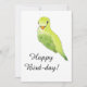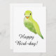 Dies ist eine Geburtstagskarte, die einen schönen grünen Vogel auf dem Bild hat. Die Karte macht eine leichtere Stimmung, indem sie einen Pun platziert.