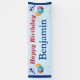 Herzlichen Glückwunsch zum Geburtstag personalisiert für einen Jungen oder einen Mann jeden Alters. Farbenfrohe Ballons, Stars zum Feiern, blau gestreifte Grenze. Personalisieren Sie sich einfach mit dem Namen des Jungen. Dieser Banner ist einfach, lustig, festlich und leicht lesbar, wenn man ihn draußen vor dem Haus oder bei einer Geburtstagsfeier eines Kindes aufstellt. Eine große Überraschung für jeden Jungen oder Mann! Dieses Geburtstagsbanner hat kein Geburtstagsjahr, sodass es für viele Jahre wiederverwendet werden kann. Auf blassblauem Hintergrund oder, falls gewünscht, auf Weiß wechseln. Die Textgröße kann bei Bedarf geändert werden. Erhältlich für drinnen oder draußen, siehe Auswahlmöglichkeiten.