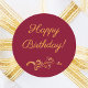 A classic burgundy colored background. Text: Happy Birthday! Decorated with faux gold swirls and leaves.
