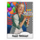 Klassische 1960er Jahre Vintag- oder Retro-Aufnahme einer Frau mit einem aufregenden Kuchen und Ballons sendet eine festliche Geburtstagsbotschaft.