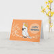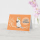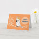 A cheerful and modern digital illustration of a white cockatoo parrot with a bright yellow crest. The bird is perched on a stylized botanical branch against a vibrant orange backdrop, featuring a speech bubble with the text "HAPPY BIRTHDAY."